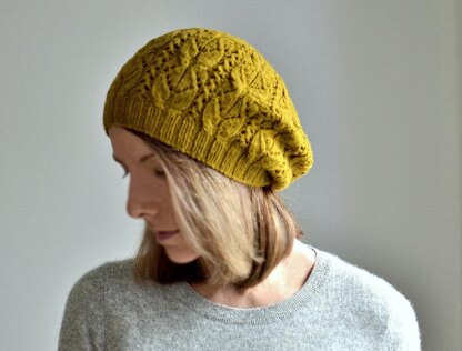 Basic cable and lace patterns transition smoothly from a ribbed edging to the beautifully shaped crown of this elegant hat. A gently slouched silhouette frames the face with flattering proportions, making this a great-looking project that will fly off your needles with impressive results.