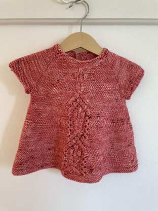 The Bouquet de Fleurs baby dress & top is worked top down, starting with the garter stitch neckline. The neckline is shaped using short rows and worked flat, then the work is joined in the round and an intricate lace panel is added on the front. Body and sleeves are divided, and for the dress, increases shape a widening skirt. Or, less shaping and a shorter length creates a top instead of a dress. At the bottom, the hem is worked in garter stitch to mirror the neckline edge. The short sleeves are finished with a garter stitch edge as well, and a little button or ties are added for a closure on the back, making the garment complete.