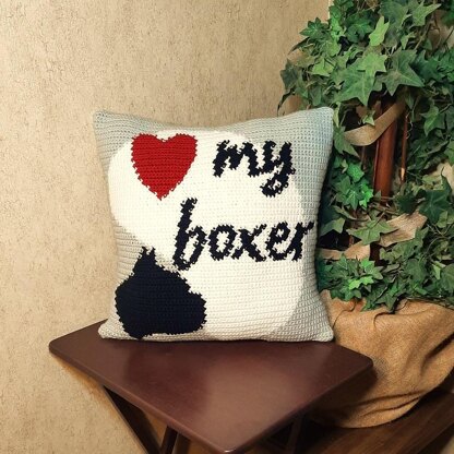 Pattern includes instruction and tips for how to do intarsia crochet, specific instructions for THIS particular pattern and a colored graph. “I Love This Yarn” brand yarn was used for this pattern, however any medium weight (#4) worsted weight yarn with comparable colors can be used. Front of the pillow has the boxer art, the back is plain gray.