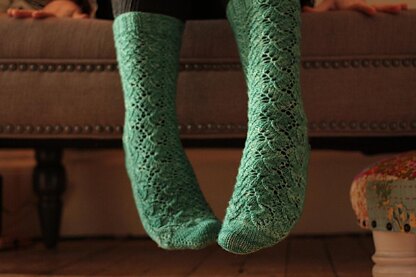 Construction NotesRows begin at the start of sole stitches, ending with end of instep chart.These socks are knit from toe up in the round, with short row toes and heels. The foot is first knit with stockinette on the sole and pattern as charted over the instep. After the heel the pattern continues around the circumference of the leg.