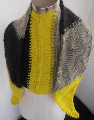 While designing and shaping this scarf, I have taken into consideration the unique and innate property of the lateral braid. The scarf is knit as one piece from the right edge to the left edge as bands of Lateral Braids knit in one color alternating with bands of Stockinette Braids worked in another color. Each band transitions into the next with a row of Lateral Braids worked in two colors. The two halves of the scarf each have 5 bands. The right half is worked using MC, CC1 and CC2 in that order. The right half then transitions into the left half in MC and then is worked using CC2, CC1 and MC. Lateral Braids worked in MC on the RS and WS in the center separate the two halves of the scarf.