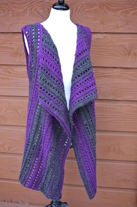 This pattern is for an open and airy vest using the soft Lion Brand Scarfie yarn. Made in one large piece so very little sewing other than a few inches at the shoulder seams.