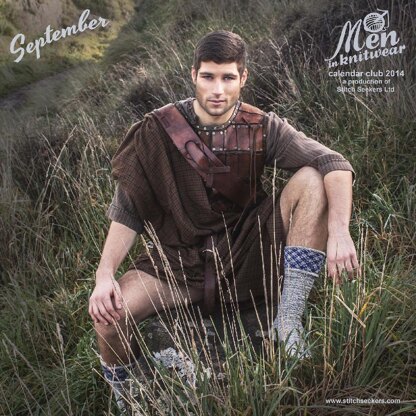 Mr September understands that a real man wears nothing under his kilt but always has warm, cosy feet. These socks are knit toe-up with sock yarn held double, in an Interrupted Rib stitch pattern for a super bouncy underfoot experience. When worn with short boots the eye-catching plaid cuff is shown off to best advantage.