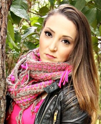 It is very easy and can be worked by beginners also. I used a very soft and warm acrylic-wool-alpaca blend yarn in milky brown as main color and small quantities of neon pink, magenta, brown and beige colors. This pattern is ideal for using your stash. You can use your imagination and play with other color combinations. It is decorated with fringes on both sides.