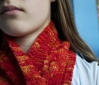 Brighid, or Brigit, was a fire goddess traditionally worshiped in Celtic Polytheism. This short scarf pays homage to Celtic heritage with a simple cable plait. It keeps the neck warm without extra frills and ends, but could be seamed to make a cowl or be made longer. The orange version in the photos was made with Manos del Uruguay Maxima in color fire.