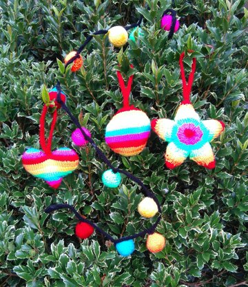 Knitting pattern for bright Christmas decorations. Instructions are given for a string of lights (not functioning, of course!), 3 bright shaped Christmas hanging decorations (heart, circle and star) and two mini stockings (for use as a table decoration, mini gifts, etc.