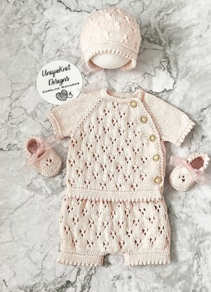 The matching bonnet and little shoes perfectly match this beautiful set.