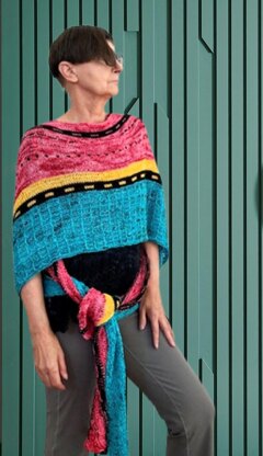 A knitted shawl wonderfully colorful, it feels extremely soft, and it is a surprisingly easy knit. Relaxing knit and purl stitches, a simple slip stitch pattern and two stranded stitch patterns make this a great project for TV knitting or crafting with friends holding down a conversation.