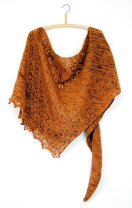 Bronze Age is an asymmetrical triangle shawl worked in fingering-weight singles. This top-down shawl gradually shifts from stockinette to simple eyelets to increasingly elaborate lace patterns. Dig through the layers of time — what riches will you find?