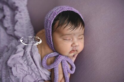 SIZE: photographer's 'newborn', 5 to 8 lbs SKILL LEVEL: Beginner, this bonnet is knit flat, then seamed YARN WEIGHT: #1 Fingering NEEDLE SIZE: 3.25mm (US3) TECHNIQUES USED: Knit, purl, and knitting two stitches together. TIE OPTIONS: Crocheted ties, I-cord ties, or knitted ties LANGUAGE: English TERMINOLOGY: Standard US
