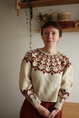 The pullover is knit top-down in the round with a stranded colourwork pattern around the yoke and at the bottom of the sleeves. The body is boxy and the sleeves are loose around the arms and tapered towards the cuffs. The neck is folded inwards and sts for the ribbing are picked up from the fold.