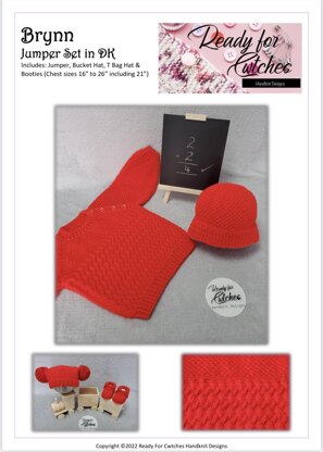 Brynn includes instructions for jumper, 2 styles of hat and booties in chest sizes 16"-26" including a 21" for toddlers who are in between sizes