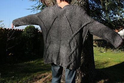 The cardigan is knitted from top down, seamless. You will start by casting on the stitches of the back and thus knit flat including step by step the Cable panel. Then you will pick up the stitches for each front that you will knit flat to the same length as back. Once you've reached the armhole length for both front, you will join the back and fronts and knit flat to the ribbed.