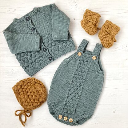 The romper is worked flat from the crotch up in 2 pieces and seamed along the sides. The bubble stitch pattern is worked in a central panel on the front only.