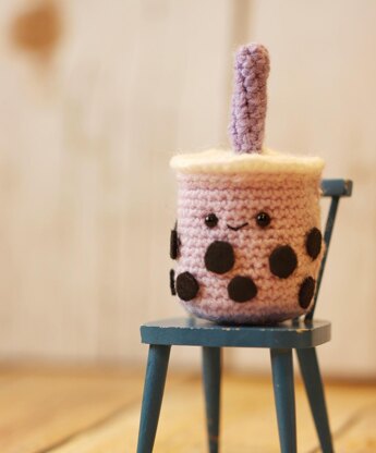 This amigurumi bubble tea is a short, chubby version of the plastic cup boba comes in, with a short straw in a complementary color. One of my favorite things about boba is that the straw is oversized to account for the large tapioca pearls and they always come in fun colors. I love picking my straw to match whatever my boba order happens to be that day! This design is a short round cylinder without any tapering to maximize the chubby effect. The straw is also fairly short to match, and there’s a white cap to mimic the plastic film covering the top of the boba drink.