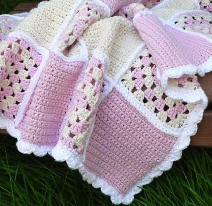 Beautiful baby blanket would make a lovely shower gift and can be made for either a boy or a girl. This blanket is made up of granny squares and single crochet squares that are sewn together. A placement chart for the squares is included with pattern.