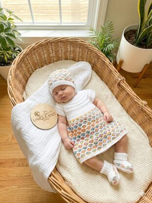 The matching Bobble hat and Booties perfectly match this beautiful dress.