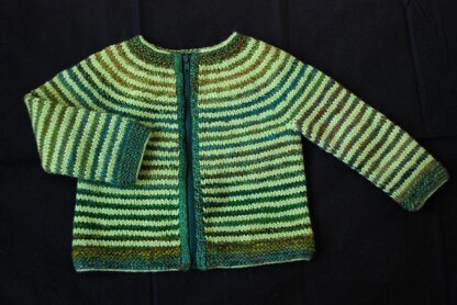 In this design, the two sleeves and the body are knitted back and forth (flat) until the armholes. The three pieces are then joined, and the yoke is worked back and forth to the end. For zipper facings, stitches are picked up along each edge of the cardigan opening, then bound off using the i-cord bind off.