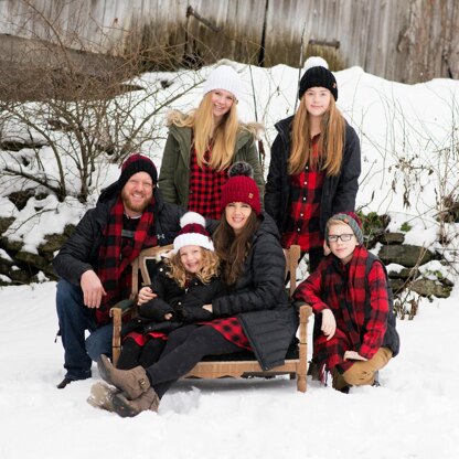 PDF digital download crochet pattern for Family set of toques. Pattern includes all 3 styles shown. Ribbed, Buffalo plaid regular band and flipped band. Comes in baby to mens sizing. Video tutorial included for child size buffalo plaid.