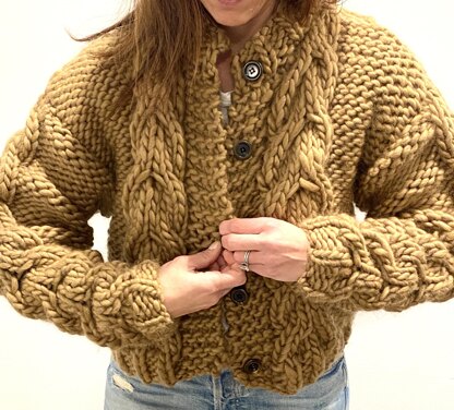 OOOH, this has to be my new favorite! This cardigan is cozy, warm, and super soft. It is great to snuggle up in on cold winter days. This quick knit sweater can be worn inside and outside as a sweater coat. This is a great pattern for a beginner knitter that is just trying out cables. It is a simple stitch pattern with a perfect beginner cable.