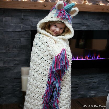 This Blanket is designed as a gorgeous hooded fringe throw. Wrap yourself up, forget your worries and be the unicorn! Or simply lay the blanket over top and admire your unicorns gorgeous mane. This fun whimsical design will make any unicorn fans day and makes the perfect gift!