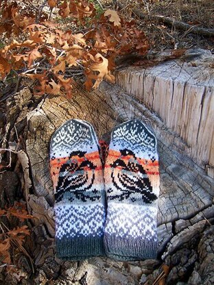 Eurasian Bullfinch. Mittens are charted in 56 and 68-st wide. Use sport-weight yarn for 56st. version, or fingering-weight for wider version. By sport-weight, I mean 6-ply sock yarns like Regia or Opal or similar. Whatever label says, Teksrena and similar yarns with 350 m/100 g knit more like fingering-weight. Miminal duplicate stitch embroidery required (see a few white stitches on birds wings and eyes). The charts are, as always, in full color, but you can easily use fewer colors (I did).