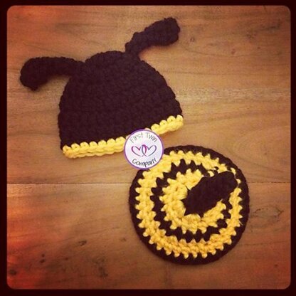 This pattern is for a newborn sized Bumble Bee set that includes a hat and bum cover as shown.