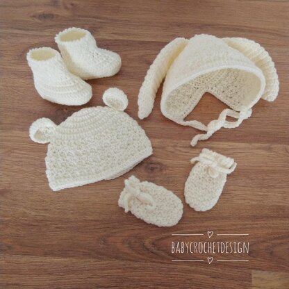 This super cute matching baby set comes with a choice of beanie or bonnet with bear or bunny ears, with matching boots and mittens. They are simple and work up quickly making a super cute baby gift.