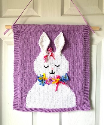 Easter Bunny / Spring Wall Hanging What a fun way to help enter into Easter and Spring at the same time! We had so much fun working on this, we are sure you will love it too. This is a nice, finished size of 15 by 17 inches, which will knit up so cute to hang on the back of a door, over a kitchen cabinet, hang in a window, anyplace in your home to remind you Spring is in the air! Children of all ages will love looking at this cute hanging. You can embellish the hanging as you wish with ribbons, silk flowers or even beads. Have fun with it and let the kids pick out how you want to trim and embellish this cute bunny wall hanging! Worsted weight yarn, knitting needles US # 8.