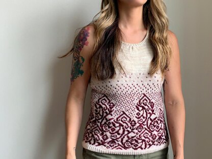 Burgeoning is knit bottom-up in the round, then separated at the armholes and knit flat front and back and seamed at the shoulders. German short rows are used for neckline shaping, and the neckband and armholes use picked-up selvedge edging for finishing.