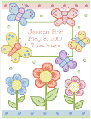 Butterflies and Blossoms. Decorate your nursery with this sweet counted cross stitch chart Butterfly Birth Announcement by Linda Gillum. The simple design of this birth announcement makes it versatile in any decor.\n