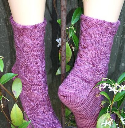 I call this the "how many cables can I cram into one sock?" sock. It's toe-up with a gusset and linen-stitch heel flap. Very fun to knit!