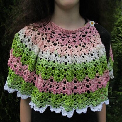 Featuring beautiful Butterfly stitches, this fashionable wrap is buttoned at the top and can be crocheted in 2 sizes with DK/Light Worsted yarn (choose a yarn that is soft and will drape).