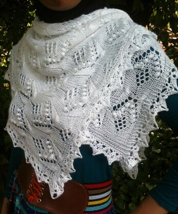 This is a square lace shawl in Estonian lace butterfly motif. You need to be familiar with combinations of lace and cables. The edging is crocheted with easy shell and picot edging. You can easily adjust the size of this shawl by adjusting your needle size or by adding more repeats. Instructions are both charted and written.