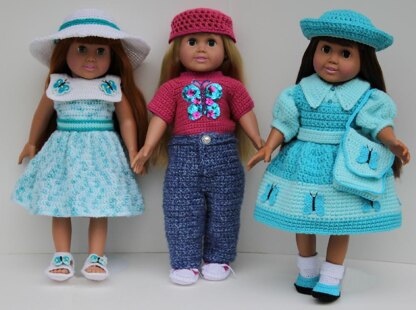 Butterfly Doll Wardrobe, #210. Three complete crochet outfits for your American Girl Doll or similiar sized 18 inch dolls. Includes instructions for square collared dress, made from sport/baby yarn; shawl, hat and sandals made from size 3 (or substitute sport/baby); jeans made from worsted weight; t-shirt and hat from sport/baby yarn; tennies from size 10 crochet thread; butterfly applique outfit, hat and purse made from worsted and baby yarn; shoes made from size 10 crochet thread.