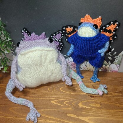 A pair of butterfly wings for small knit creations! These are just the wings, with a monarch style, meant to sew onto your work as a decorative embellishment. I sized it to be compatible with the dotpebbles frogs I make, and the Toad Familiar pattern by Magewood Whimsies. The pattern includes written instructions and photos, at present there is no colorwork chart available.