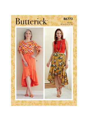 Röcke in Wickeloptik mit seitlichen Knöpfen oder Bindebändern in der Taille, mit Prinzessnähten und tiefem Volant mit rückwärtigem Saum. Nähwert: Leicht.