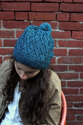 Bywater features delicate lines that showcase the various shades of blue in this beautiful Nice and Knit DK yarn. A deep ribbing and a slipped stitch edge create a cool transition from brim to cables, and these cables are fun to work. There's something addictive about seeing where the next cross is going to take you.