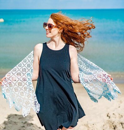 This wonderful wrap is worked in a beautiful filet lace pattern as light as the mist off the waves. The beauty of the pattern is that the top and bottom edges of the wrap are worked in triangular motifs that create a delicate gorgeous shape. Floaty and ethereal, pair this wrap with a lightweight dress for an effortlessly beachy ensemble.