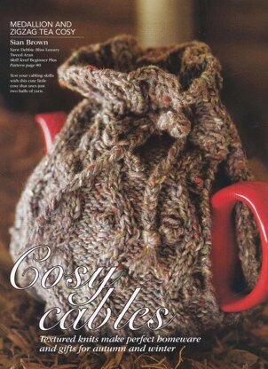This is a pattern for a Cable and Bobbles Tea Cosy, originally published in Knitting magazine issue 174. It has a medallion and moss cable, a zig zag and bobbles cable, and rib top border. It has eyelets and a tie to secure. Photos Laurel Guilfoyle for Knitting magazine.