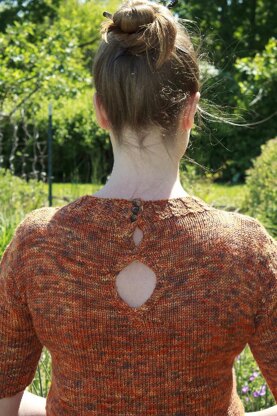 This pattern was inspired by vintage office wear. It is intended to fit with zero ease at the bust, slight ease through waist and hips, for a fitted, retro silhouette. A high neckline balances the open cable keyhole in the back, and a cabled collar finishes it nicely. Short sleeves allow for year round wear.