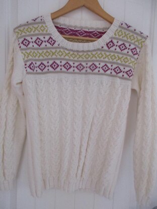 This is a pattern for a fairisle and cable jumper, originally published in Simply Knitting. It has a fairisle yoke on the front and back and repeating cables. Length 60-66 cm.