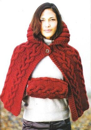 This is a pattern for Cable Cape, originally published in Knitting magazine. The yarn has now been discontinued, any yarn knitting to the tension can be used. The muff is knitted on 10mm straight needles, 2 x 50 gm balls yarn. Photos Laurel Guilfoyle for Knitting magazine.
