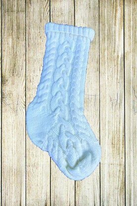 The Cable Christmas Stocking is worked in the round from the top down. The stocking features 3 cables on both the front and the back of the stocking. The heel is worked with German Short Rows, and the toe is worked with a double decrease and is finished with the Kitchener Stitch.