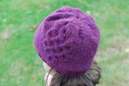 A beanie style hat, knitted from brim up in reversed stocking stitch with a large cable motif on its side. This hat is finished with pleats at the base of the crown shaping that create a soft gathered finish.