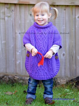 Cable Fantasy Poncho is stylish and super comfy clothing for your little one. It is designed to keep your little one warm and cozy. It is quick and fancy project for those who love cables. Beautiful cable pattern and simple design create a unique and stylish look. Poncho has short raglan sleeves, round bottom line and big ribbed collar.