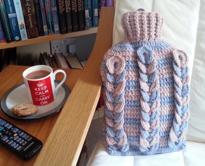 This hot water bottle cover is made using the most snuggly soft yarn I have worked with to date! The interesting cable pattern is on one side only, so it doesn't impede the warmth that comes through on the reverse.