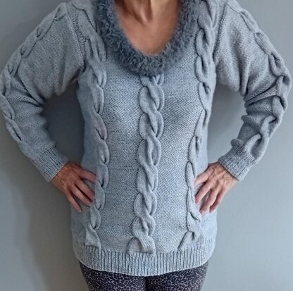 Super stylish cable jumper with fur collar. Knitted in a choice of one or two colours. Hugs and flatters all body shapes and with a flattering scoop neckline it is a eye catcher. A must for funky leggings and jeans.