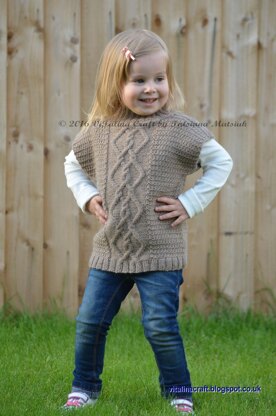 This universal and stylish vest is must have for any wardrobe and fancy project for those who love cables. It is designed to keep your little one warm and comfy during cool autumn/winter days. The front is knitted with pretty textured stitch and fancy cable at front. Front and back of vest are knitted from bottom up back and forth. The neck is knitted in the round after the shoulder seams are closed.