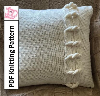 This interesting twisted knitting pattern set on a reverse stocking stitch background is not really a cable, but it is fun to knit and makes for an unusual pillow cover.